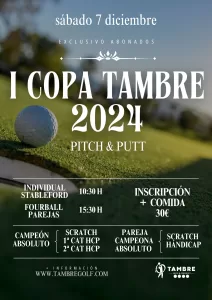 El sábado 7 de diciembre se celebrará la I Copa Tambre Pitch & Putt, torneo absoluto del club exclusivo para abonados. Jornada de 36 hoyos, Individual Stableford por la mañana, comida y Fourball parejas, en el turno de tarde.